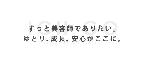 ブランクのある方は、まずはお会計や、シャンプーや白髪染めなどできることからで大丈夫です。経験を積めば、幹部などへのステップアップや独立も可能です。賞与や昇給など、あなたの頑張りはしっかりと評価します。もちろん、売上のノルマなどを強制することもありませんのでご安心ください。美容師として輝き続ける夢を、ICH・GOで実現させましょう!